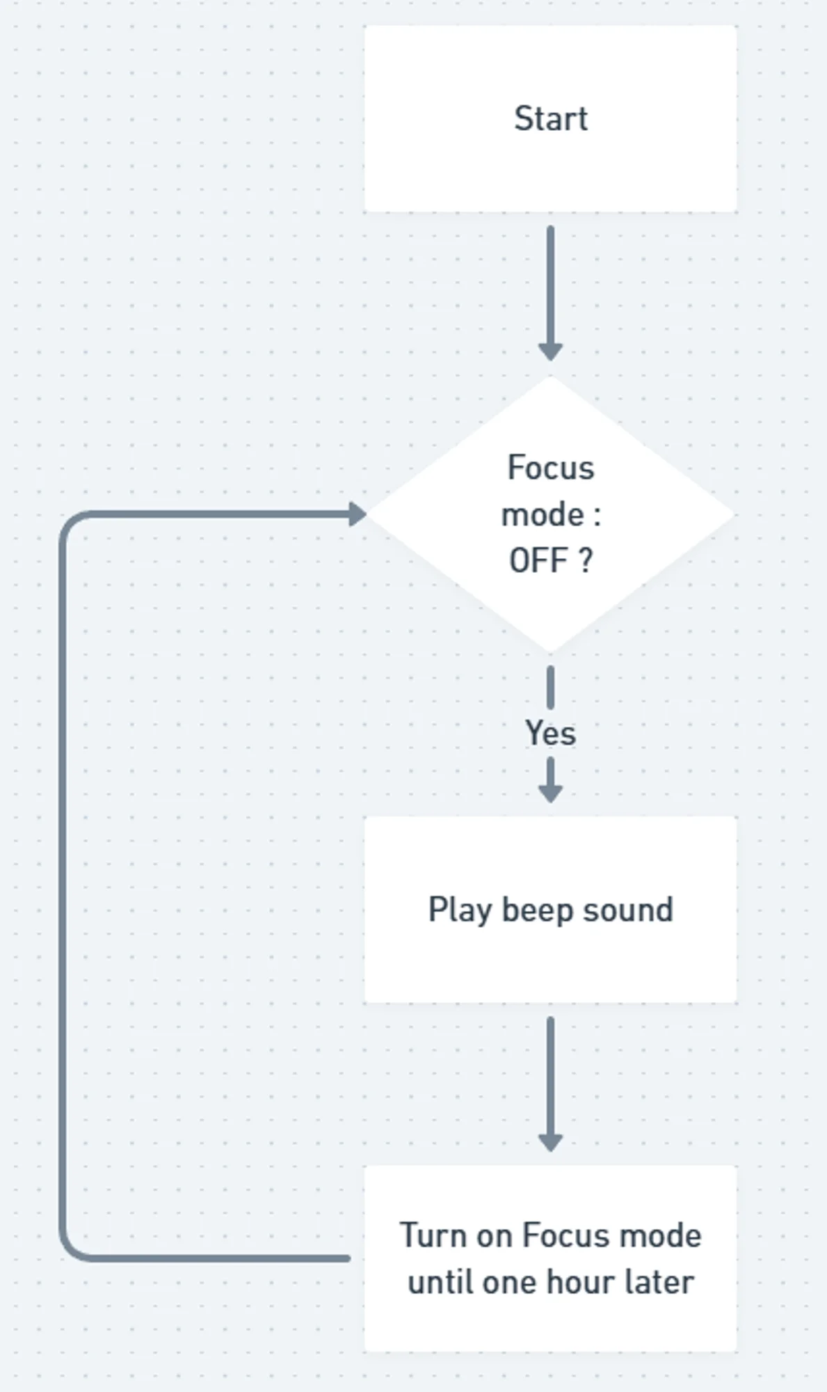 Before getting started, let’s quickly look at how the whole system works. The idea is to create a loop that automatically activates and deactivates every hour. To achieve this, we will combine two elements: iOS shortcuts and a dedicated Focus mode. Why use a Focus mode? Because it can be turned on or off through shortcuts, which allows us to create an autonomous loop. Below is a simple diagram to make it easier to understand: