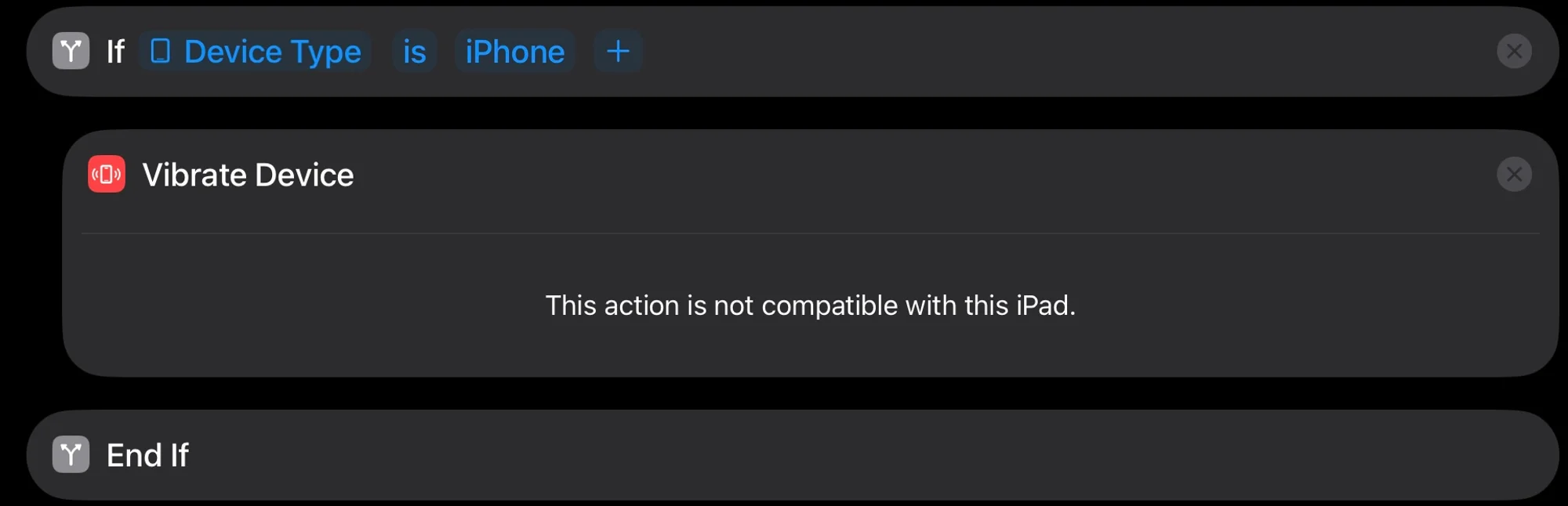 Add a condition to check whether the device is an iPhone: if so, you can make the iPhone vibrate. This step must be conditional because the vibration action does not exist on iPad or Mac (iPads and Macs do not vibrate).