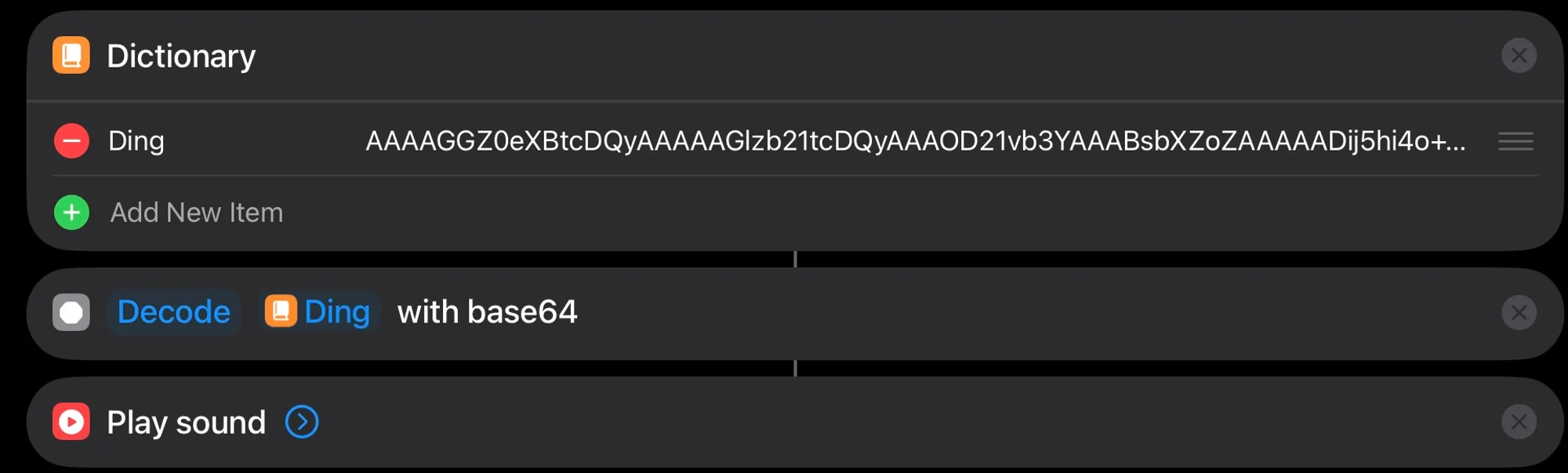 Next, create a dictionary with a key (for example “Ding”) and paste the Base64 text into it. Use the “Decode” action to obtain the sound, then test playback.