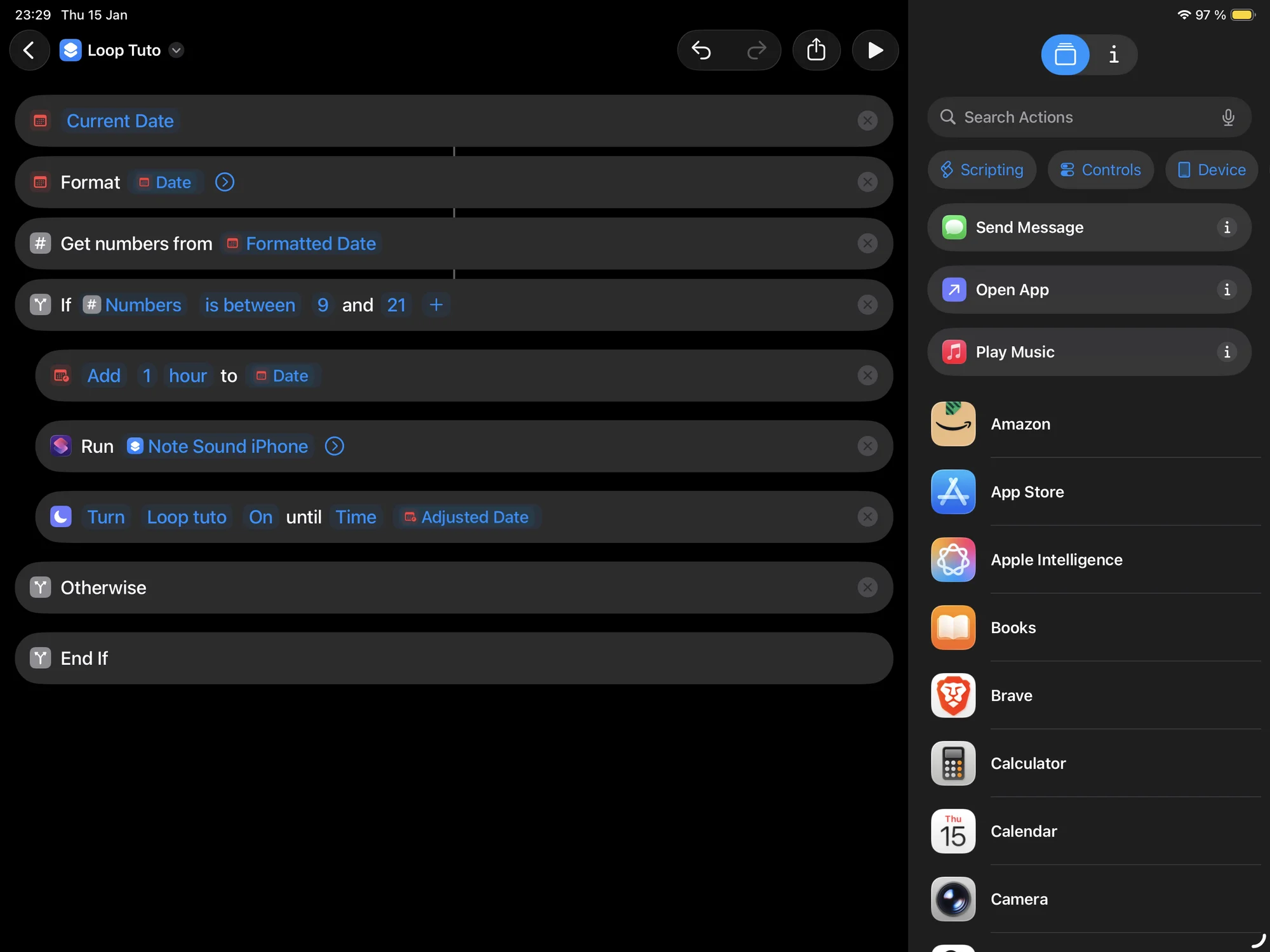 If the condition is met, add one hour to the current time, run the first shortcut (the one that plays the sound), and then reactivate the Focus mode for one hour. This is what maintains the loop.