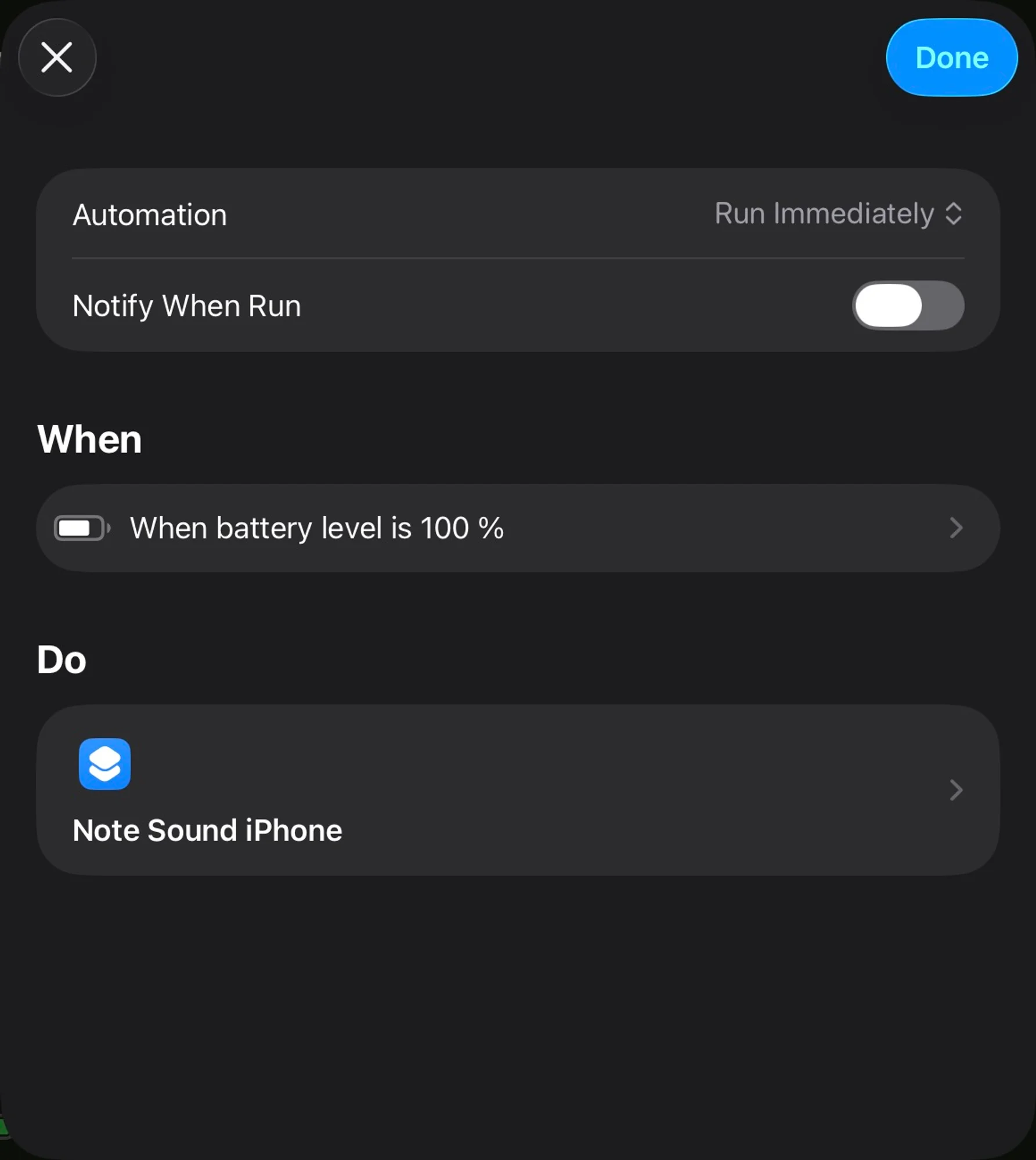 You can reuse the “Note” sound for other automations, such as being notified when the battery reaches 100%.