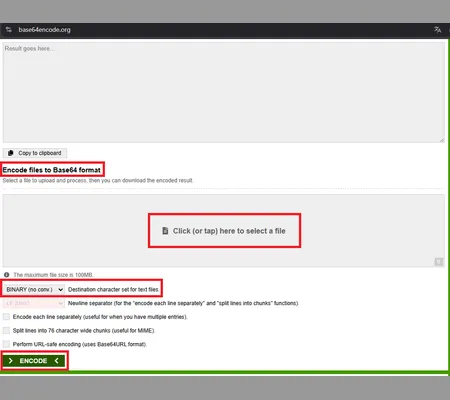 Téléchargez d’abord le son depuis YouTube ou toute autre source. Si vous disposez d’un compte YouTube Premium, l’opération est très simple. Par la suite, convertissez le fichier en Base64. Ce format textuel est léger et compatible avec les actions de décodage de l’app Raccourcis. Pour cela, rendez-vous sur https://www.base64encode.org/, importez votre fichier, puis récupérez le texte généré (les éléments importants sont marqués en rouge dans la figure suivante).