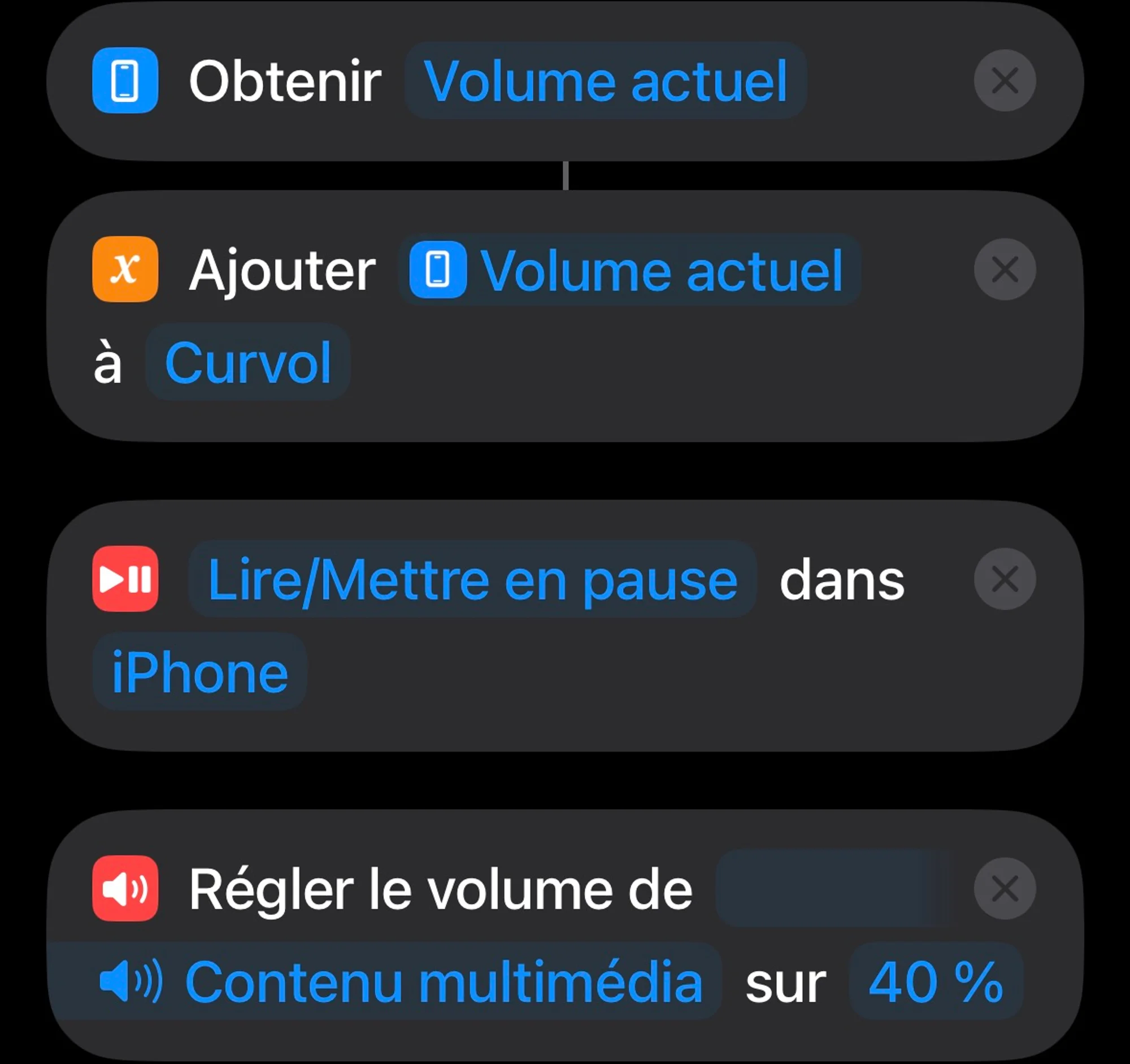 Commencez par sauvegarder le volume actuel dans une variable afin de pouvoir le restaurer à la fin. Avant de jouer le son, ajoutez une action pour mettre en pause tout contenu multimédia en cours, afin que le bip soit bien audible. Réglez ensuite un volume suffisant.