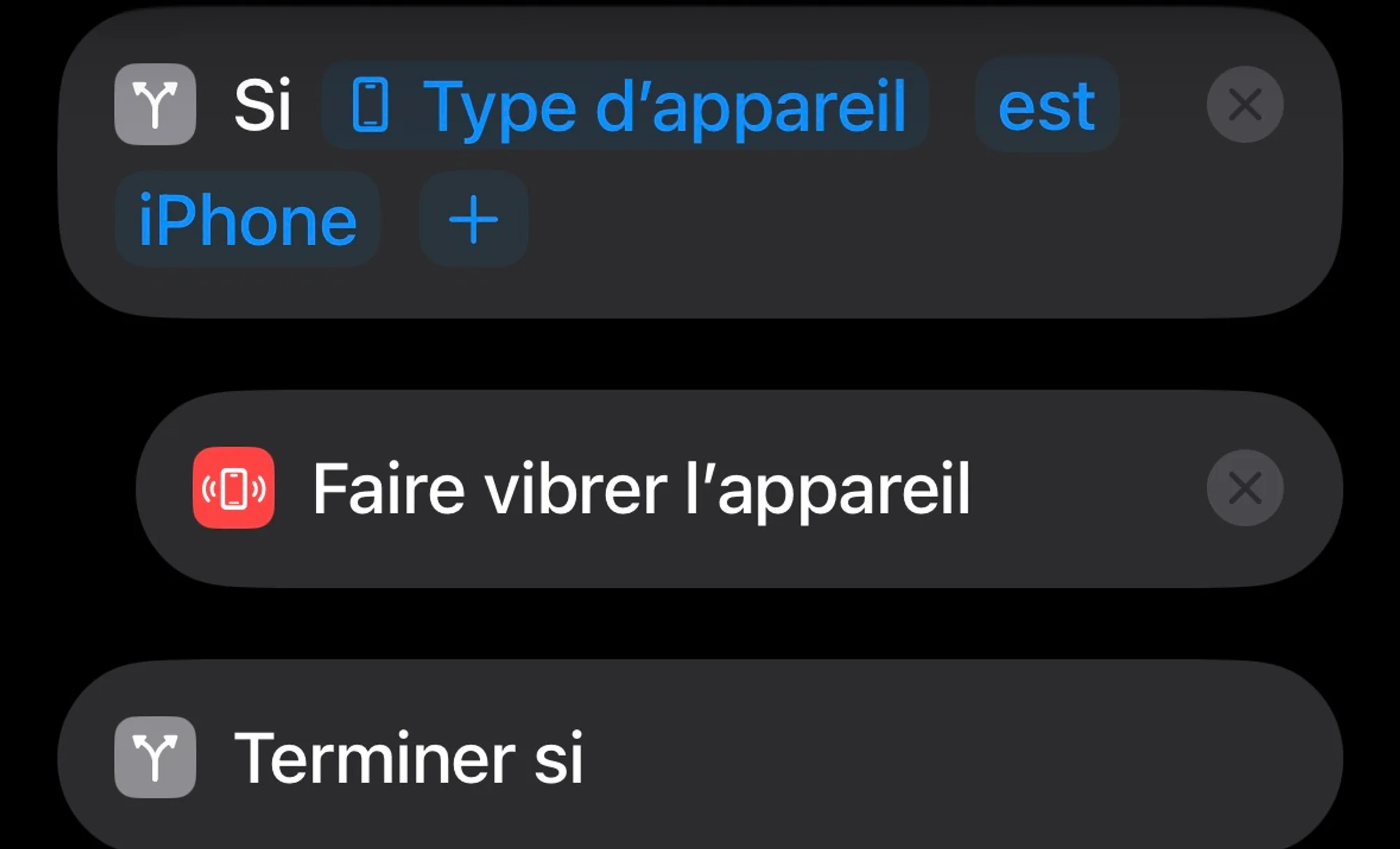 Ajoutez une condition pour vérifier si l’appareil est un iPhone : dans ce cas, vous pouvez faire vibrer votre iPhone. Cette étape doit être conditionnelle, car l’action vibration n’existe pas sur iPad ou Mac (les iPad et Mac ne vibrent pas).