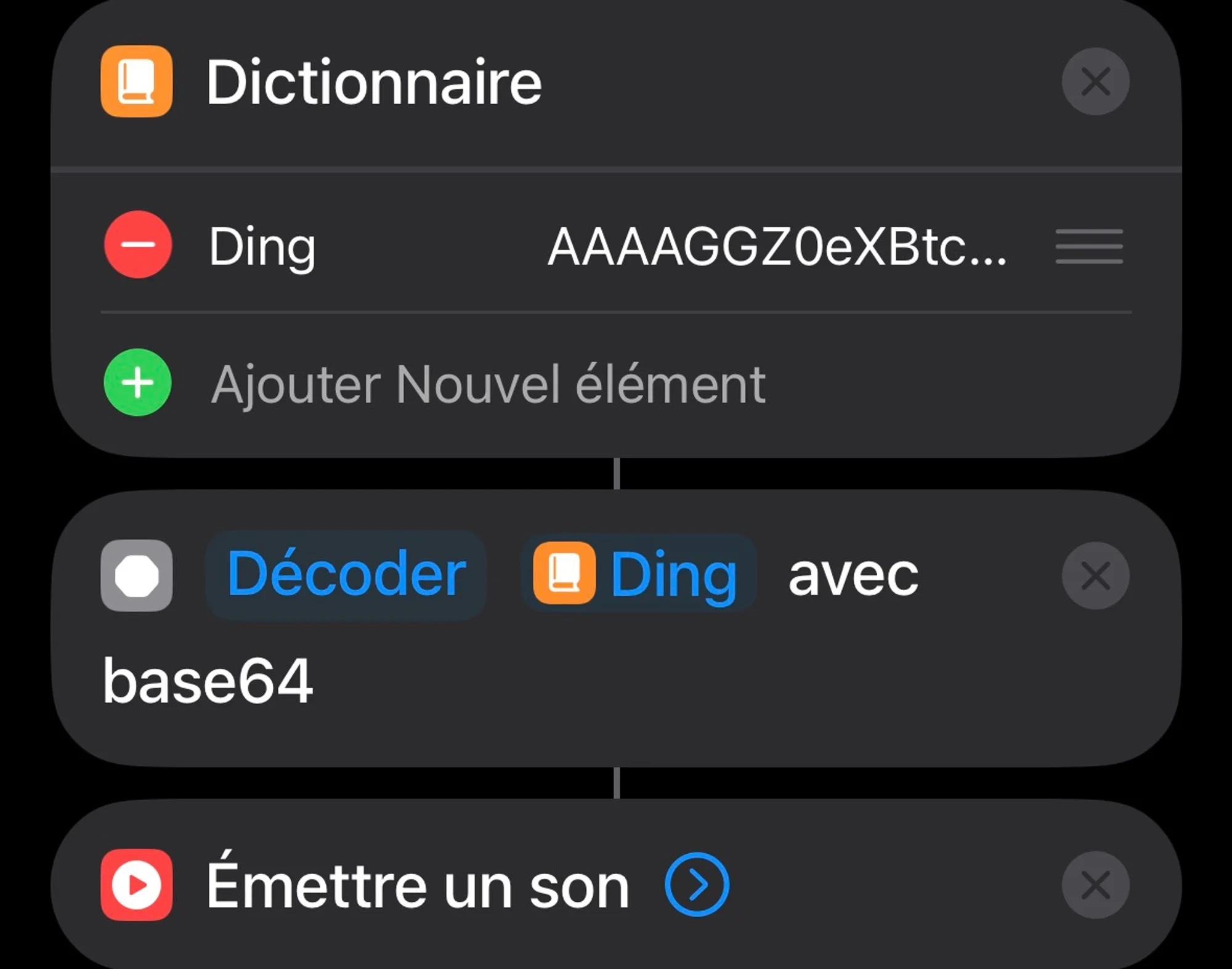 Créez ensuite un dictionnaire contenant une clé (par exemple « Ding») et collez-y le texte Base64. Utilisez l’action « Décoder » pour obtenir le son, puis testez la lecture.
