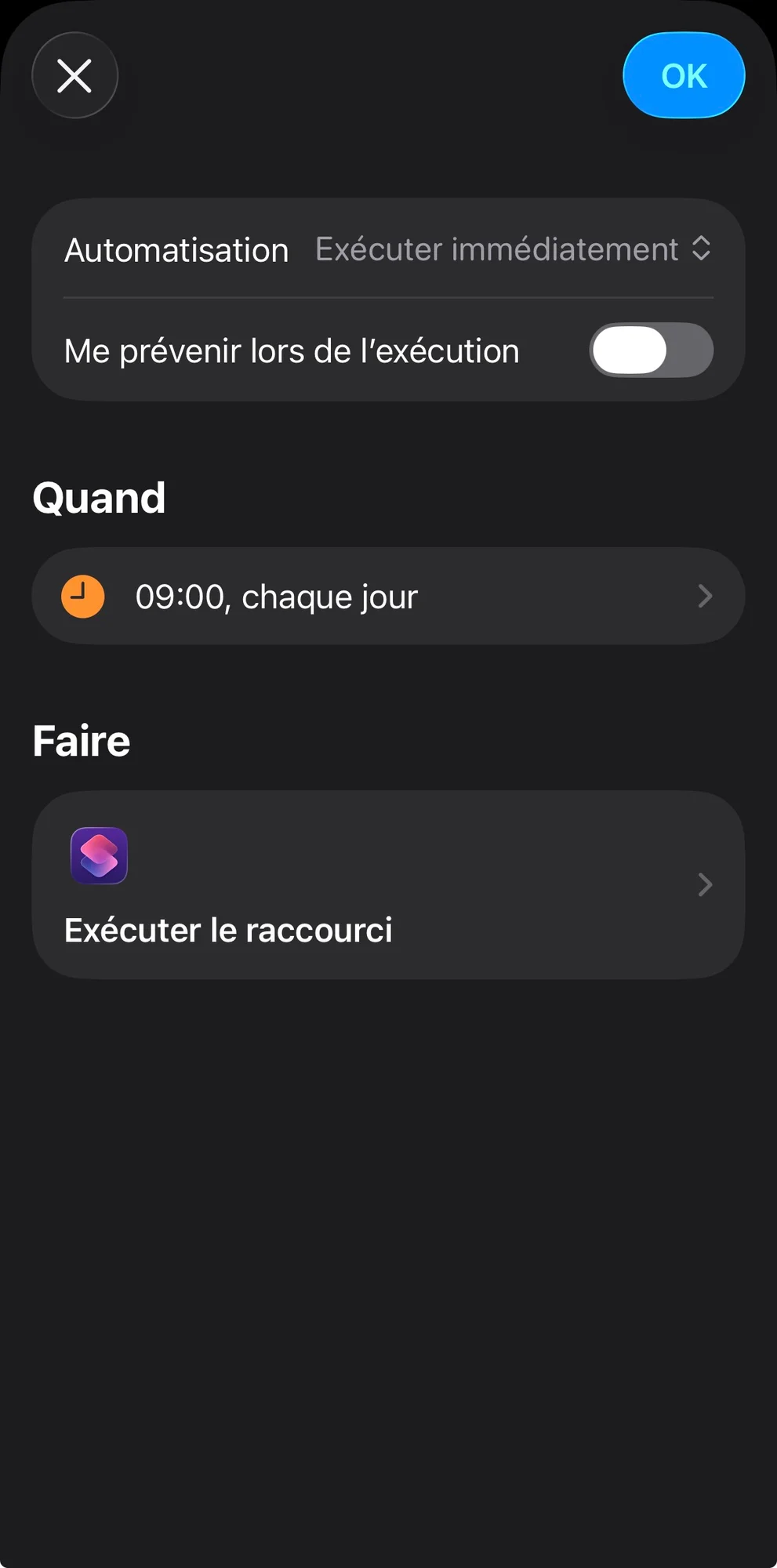 L’automatisation sert à détecter la désactivation du mode de concentration et à relancer le second raccourci. Dans l’app Raccourcis, ouvrez les automatisations, sélectionnez le mode de concentration créé précédemment, puis choisissez l’action à exécuter lorsque ce mode est désactivé. Sélectionnez le second raccourci.